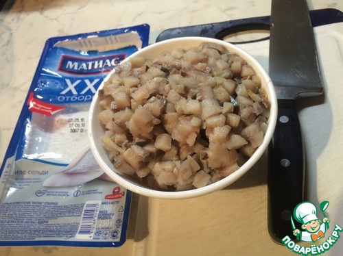 Селедка: я использовал Матиас, Филе в масле. Все масло вылить в картошку и морковь. Филе мелко порезать.