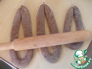 Завязать каждую колбаску по краям и проткнуть иголочкой по всей длине, прижимая к столу, чтобы выходил лишний воздух. Я сделала несколько мелких колбасок и отварила на обед, уже было вкусно! Повесьте ее в проветриваемом месте, можно на балконе, или чердаке, в холодильнике.