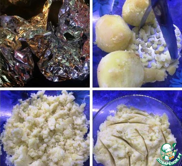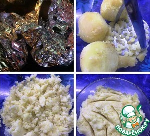 Запекаем картофель в духовке до готовности. Чистим, разминаем до состояния пюре.