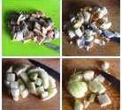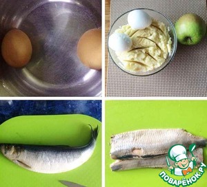 Нарезаем на кусочки сельдь, лук, яблоко, яйца.