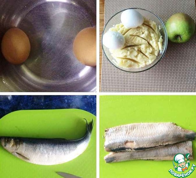 • Нарезаем на кусочки сельдь, лук, яблоко, яйца.
