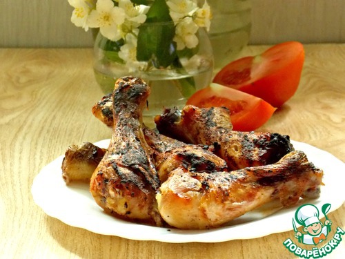 Подготовить мангал для приготовления курицы. Для приготовления голеней я воспользуюсь сковородой-гриль от "Forester". Очень хорошая вещь я Вам скажу. Прекрасно устанавливается на гриле и имеет антипригарное покрытие. Смазываю сковороду маслом и укладываю голени. Жарим до готовности со всех сторон, даже со стороны крепления конечностей. Сковорода для этого подходит идеально.