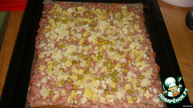 Сверху выкладываем картошку и немного горошка.