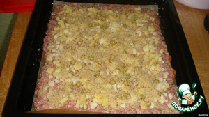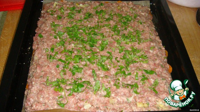 Сверху выкладываем оставщую часть фарша и посыпаем зеленью.