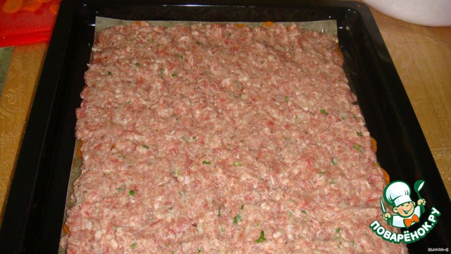На морковь выкладываем фарш (больше половины).