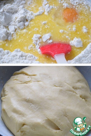 В муку с крахмалом и содой добавляем вышеприготовленную смесь, яйцо и замешиваем нежное, мягкое, слегка липковатое тесто. Накрываем чашку пленкой и убираем в холодильник на 1 ч. 30 мин. - 2 ч.