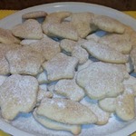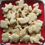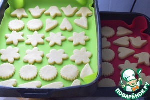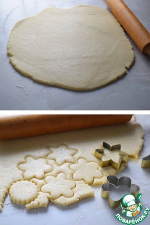 Холодное тесто выкладываем на слегка припудренный мукой стол и раскатываем в пласт толщиной 5 - 7 мм, формочками вырезаем печенья.