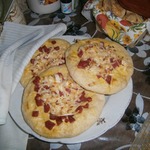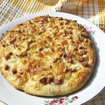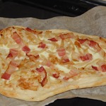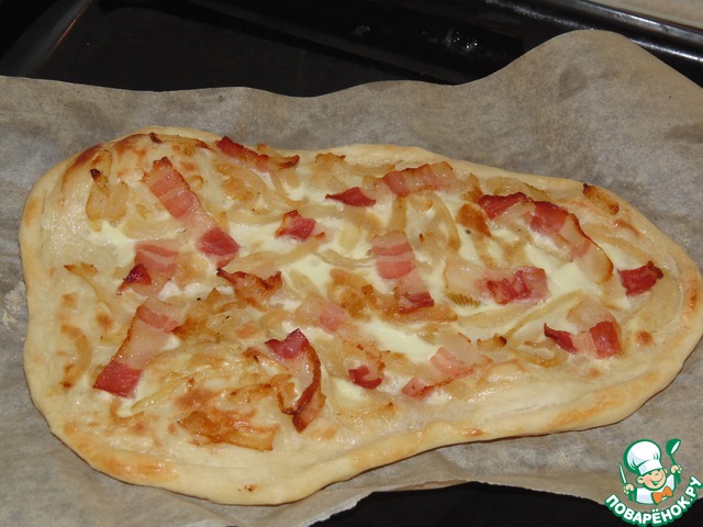 Давным-давно в немецких деревнях хлеб пекли в дровяных печах, как правило, раз в неделю. Запах теста стоял умопомрачительный, и, конечно же, ребятишки просто не могли дождаться, когда из печи вынут каравай. Еще нужно было ждать, когда печь немого остынет после того, как прогорят дрова. И тогда мамочки придумали из остатков хлебного теста печь лепешки, тонко растянув тесто, намазав его сметаной и посыпав луком и шпеком или тем, что было под рукой. Заодно печь остывала до нужной температуры для выпечки хлеба. Отсюда и пошло название этих лепешек - от слова dünn "тонкий". В разных регионах они называются Dennete, Deie, Dinnede, Dinne, Dinnele oder Dinnele. Рецепт и описание от Lerele с хлебопечки.