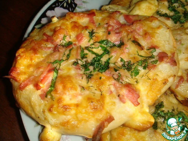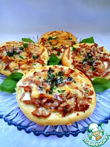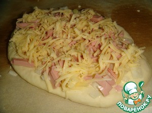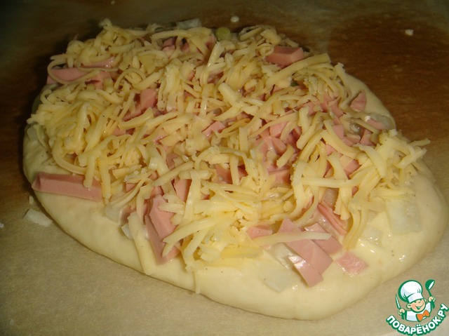 Подошедшее тесто обмять, разделить на одинаковые куски. Руками растянуть в лепешки. Каждую лепешку щедро смазываем яично-сметанной смесью, посыпаем луком и колбасой. Сверху присыпаем сыром.