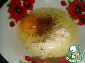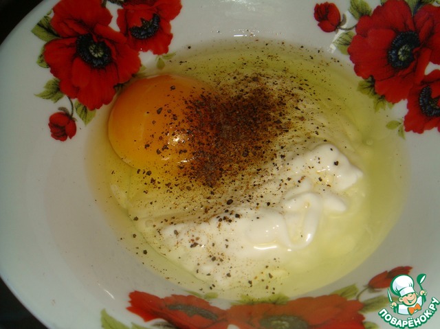 А пока подходит тесто, приготовим начинку: мелко нарезать лук и колбасу (шпек). Смешать яйцо, сметану, соль и перец.