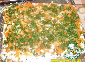 На 2 корж - крем, яйца, морковь, огурец, зелень, корж.