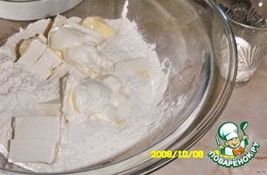 В чашку кладем размягченный маргарин, муку, сметану, молоко.