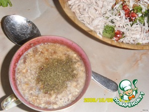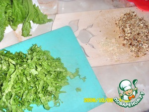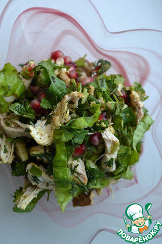 Бульн от курицы налить в чашку, всыпать орехи и добавить уксус, после облить салат.