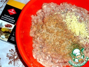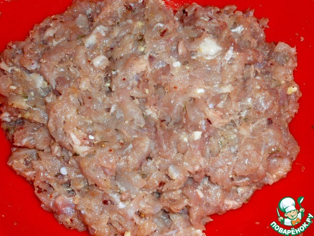 В куриный фарш добавить измельченный чеснок, специи и хлопья зеленой паприки.