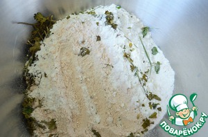 В 150 мл. теплой воды размешать дрожжи и сахар, накрыть пленкой и на 10 минут, "до шапочки". В дежу комбайна насыпать оба вида просеянной муки, сушеную душицу.