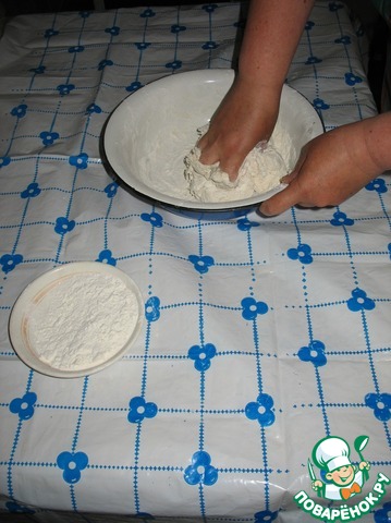 Добавляем стакан сыворотки или воды. Если тесто не лепится в комок, добавить еще чуть-чуть, чтобы получился замес.