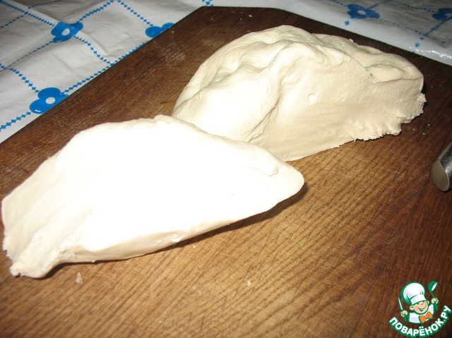 Тесто в разрезе. Абсолютно однородное. Оно быстро подсыхает. Поэтому его надо накрыть полотенцем или положить в целлофановый пакет.