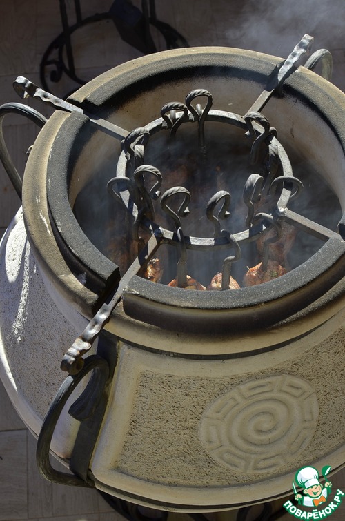 Шампуры одеть на специальную перекладину и опустить в тандыр.