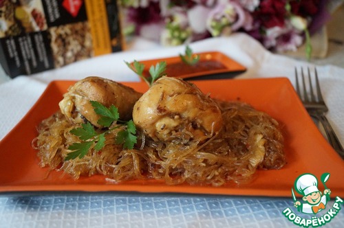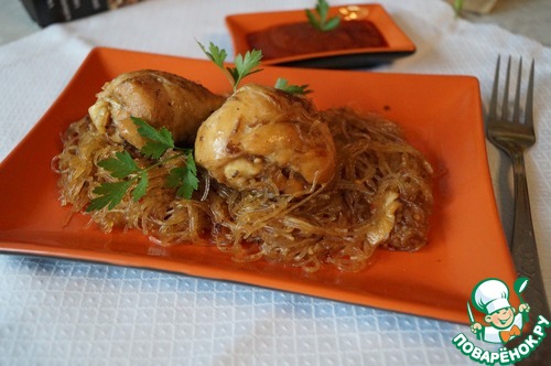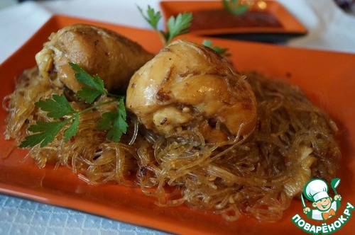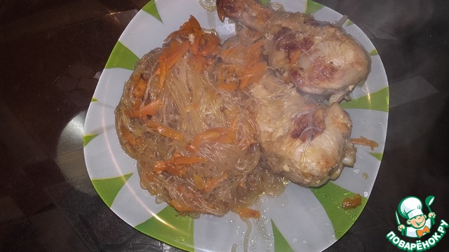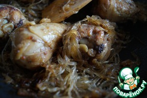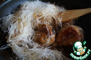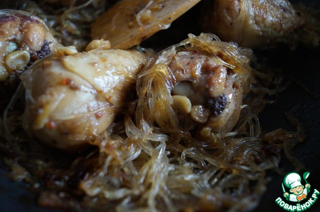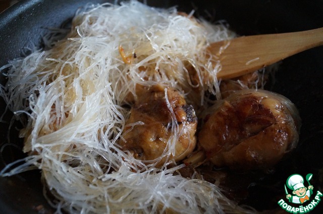 Фунчозу залить прохладной водой на 30 минут. Затем отжать и порезать. Добавить фунчозу к курице и потушить под крышкой 3 минуты.