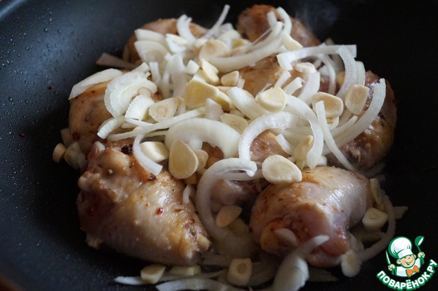 Лук нарезать полукольцами, а чеснок пластинками. Добавить лук и чеснок к курице и обжаривать еще 3 минуты.