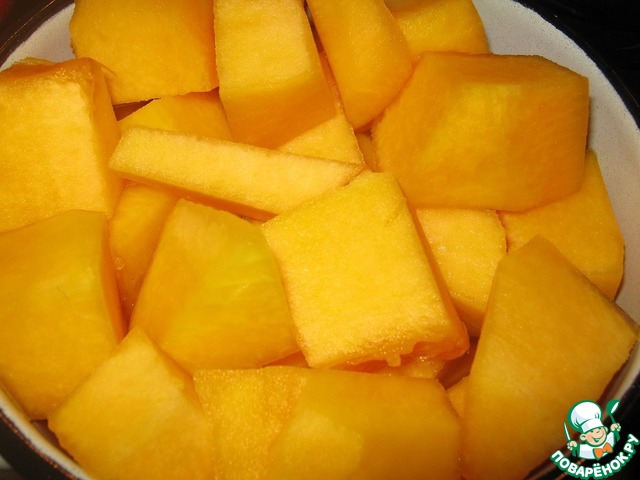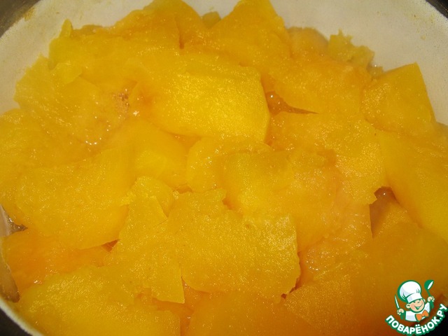 Приготовим вкусный закусочный тортик из тыквенных блинов с мясным фаршем? Тогда ставим варить тыкву 1кг
