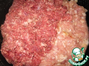 Обжариваем фарш 700гр, у меня свинина и курица, не забудьте посолить и поперчить