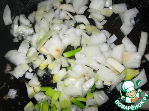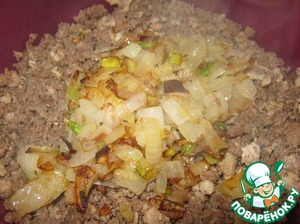 Обжаренный фарш перекладываем в глубокую чашку и добавляем к нему 3ст. л. нарезанной зелени