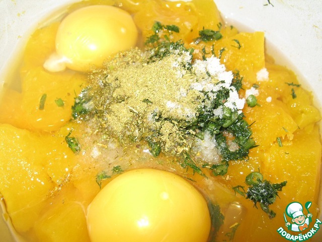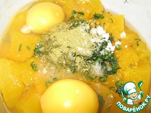 Теперь в остывшую тыкву добавляем 2 яйца, соль, сахар, зелень и щепотку хмели-сунели