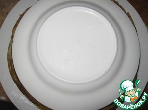 На самый верхний блинчик кладем тарелку и выравниваем по ней края блинов очень острым ножом