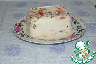 Крем. Хорошо растираем творог с сахаром и ванилью. Сливки взбиваем и соединяем с творогом. Вливаем желе со 2-й пачки. Взбиваем и выкладываем на фрукты.