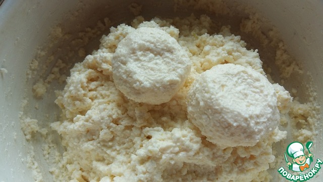 Пока кисель остывает приготовим тесто доя ленивых вареников. Творог размять, добавить сахар /у меня 2 ст. л./, яйцо, 2 ст. л. манной крупы, цедру лимона и щепотку соли. Тесто хорошо перемешать, затянуть пленкой и убрать в холодильник минимум на 1 час. Я никогда не формирую тесто для ленивых вареников в виде колбаски, потому что тогда в него надо добавлять больше манки, или муки, а просто леплю руками небольшие "шайбочки".