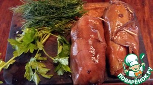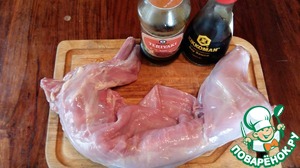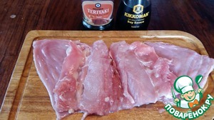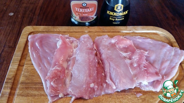 В результате получилось 2 филе, которое я замариновала в соевом соусе от ТМ "Киккоман" на 30 минут. -