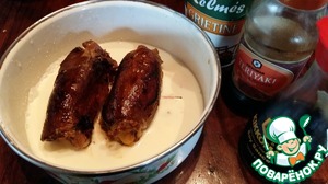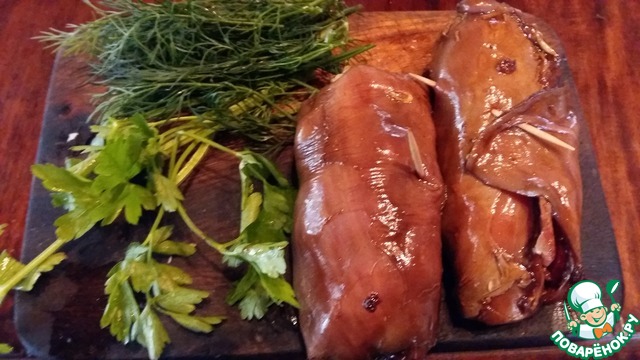 Сформировать рулетики, закрепить их при помощи нитки, или зубочистки, обмазать соусом-маринадом "Терияки"от ТМ "Киккоман" и быстро обжарить на сковороде.