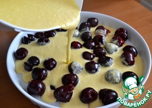 Залейте ягоды тестом, при необходимости разровняйте их в тесте равномерно по всей форме. Сверху выложите ягоды с “хвостиком”.