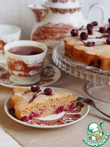Выпекайте десерт в заранее разогретой духовке 15 минут при температуре 180°C, затем понизьте температуру до 150°C и выпекайте еще 20-25 минут до нежного золотистого цвета. СОВЕТ! У меня получилось так, что ягодки с хвостиками, которые я выложила поверх десерта перед тем как поставить его в духовку, все утонули... А мне так хотелось, чтобы они оставались на поверхности, слегка запеченные, ну, совсем как на картинке в книжке! ))) Поэтому, когда я понизила температуру в духовке, я просто выложила еще 5 черешен и они получились, как надо!