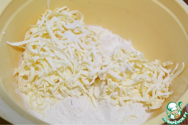 В просеянную муку натереть на терке маргарин, добавить соль и быстро перетереть вилкой в крошку. -