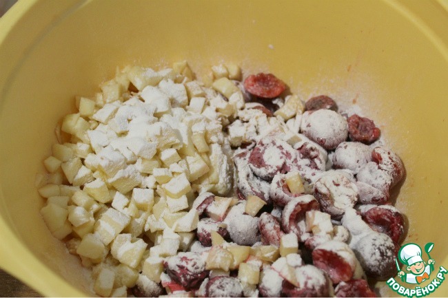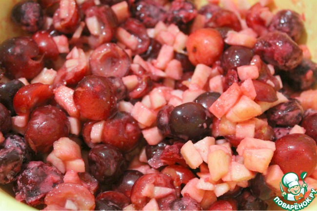 Очистить и порезать яблоки мелким кубиком или тонкими пластинками, соединить с черешней и вишней ( не размораживала)