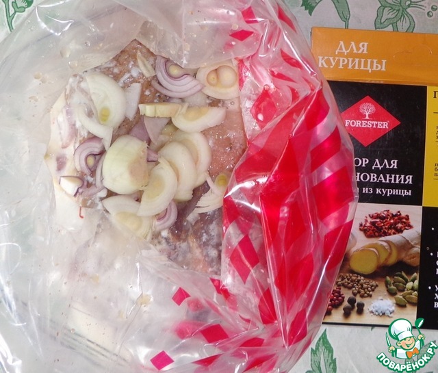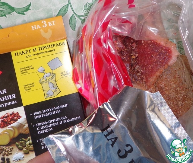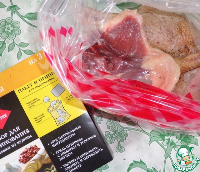 Пакет хорош тем, что в нем удобно перемешивать мясо не пачкая руки и столовые приборы, а также пакет одноразовый, то есть не нужно мыть посуду после маринада. -
