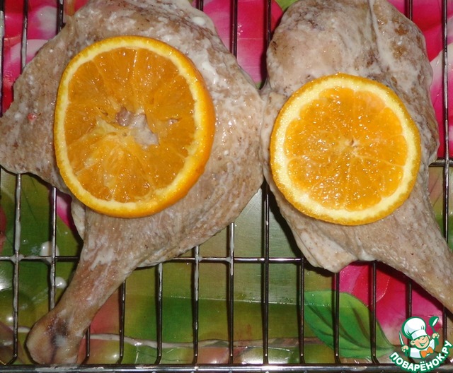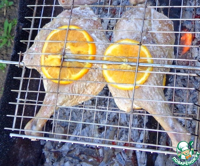 Апельсин порезать кружочками, кладем на решетку-гриль кружочек апельсина, а сверху утиную ножку, затем еще кружочек апельсина сверху.