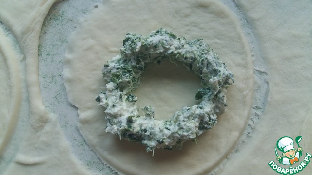 Тесто тонко раскатываем и вырезаем кружочки диаметром 10 см. На кружочек выкладываем кольцо из сырно-шпинатной смеси, в середину осторожно вливаем сырой яичный желток. Накрываем вторым кружочком теста и тщательно защипываем края.