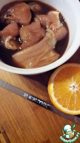 Выжать сок из 2 апельсинов, смешать его с лимонным соком, соевым соусом, вином и сахаром.