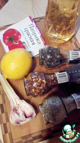 Смешать сок и цедру лимона, масло, все специи и измельчённый чеснок