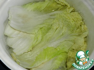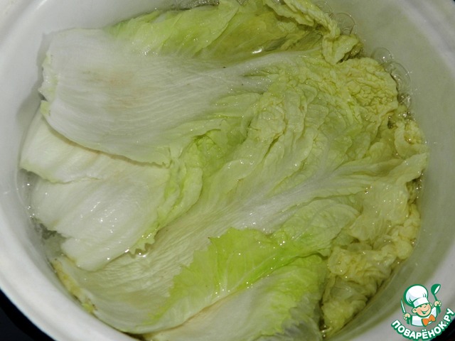 Отварить листья пекинской капусты в кипящей подсоленной воде 10 минут. Затем вытащить их шумовкой.
