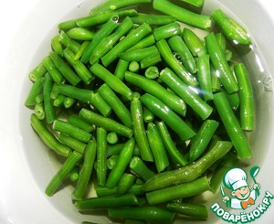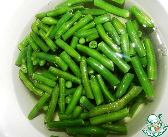 Стручковую фасоль отварить в кипящей подсоленной воде 10 минут.