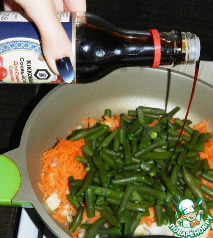 Обжарить в небольшом количестве растительного масла вместе с фасолью. Полить по поверхности соусом Kikkoman и посыпать семенами калинджи или другими специями по вкусу. -