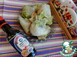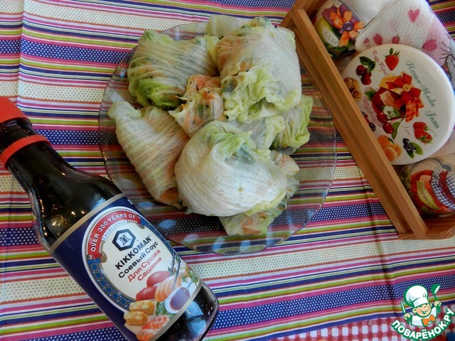 Начинку завернуть в листья пекинской капусты в форме голубцов.