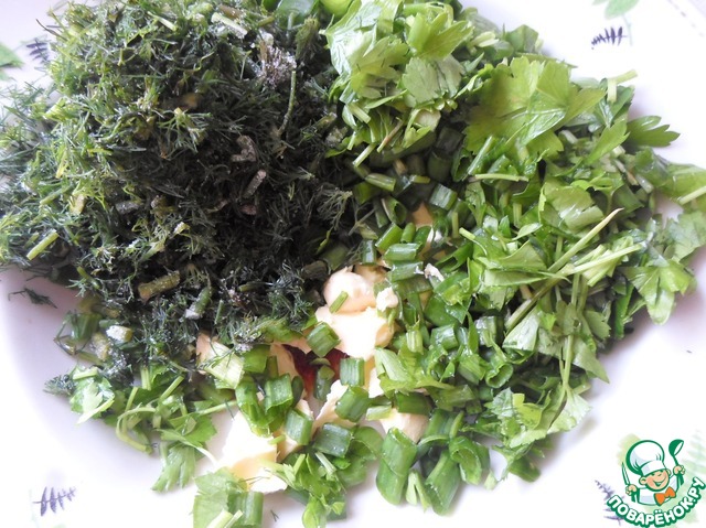 Петрушку, лук, укроп, масло сливочное измельчаем и тщательно все перемешиваем.