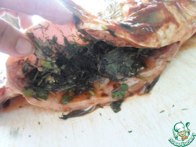 Натираем маринадом (немного маринада оставляем для начинки). -