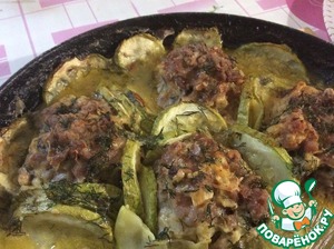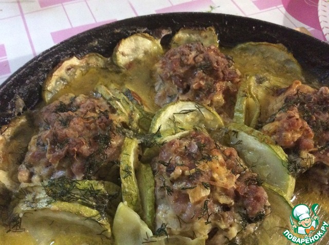 1 голень индейки мелко порезать, примерно как на салат оливье. Добавить в фарш 1 яйцо, 1 ст. л. мелко тертого молодого кабачка, соль, муку. Смазать сковородку подсолнечным маслом, обвалять в муке котлеты и отделить друг от друга кусочками кабачка.
