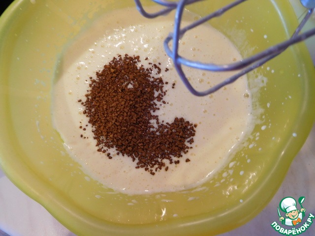 Также отправляем в тесто кофе, соду и постепенно вводим муку